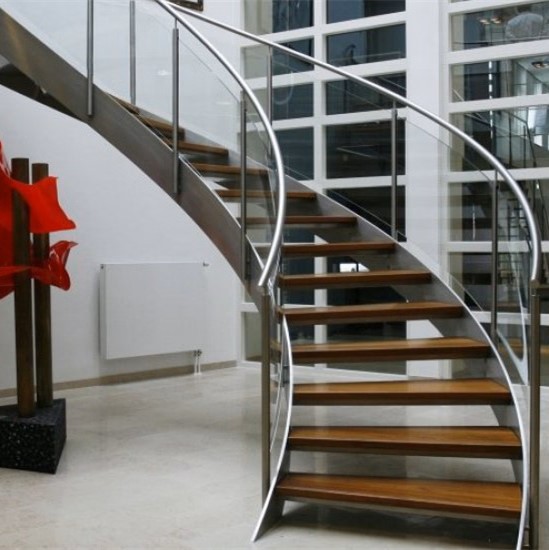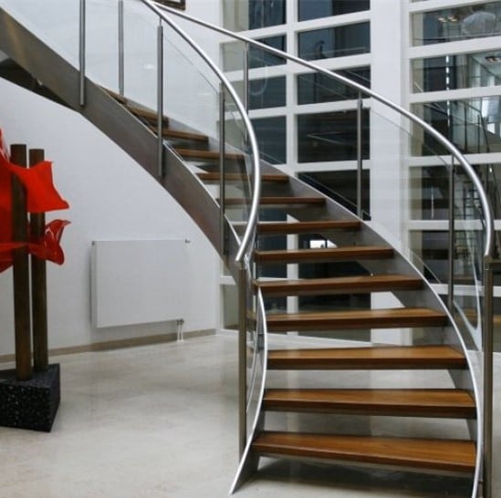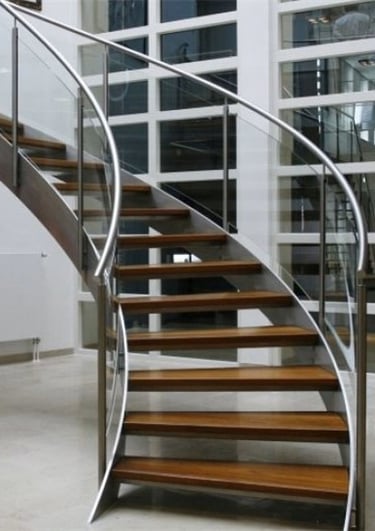 In these systems, the glass balustrades (railings) are actually the structural elements that carry the weight of the treads.