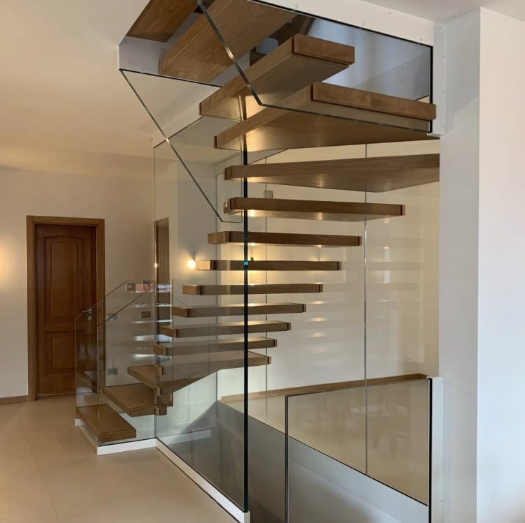 Engineering: Uses multi-layered laminated tempered glass. Treads are "sandwiched" or bolted through the glass using specialized stainless steel standoffs or pressure-fit hardware.